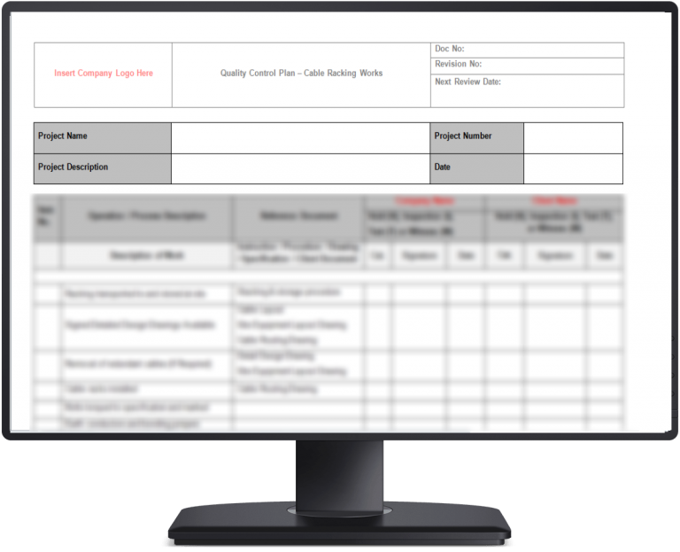 The document is a plan of control for quality in cable racking works which forms part of the Quality management sector of the business
