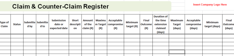 The purpose of this register is to track all recorded claims and counter claims within a specific project.