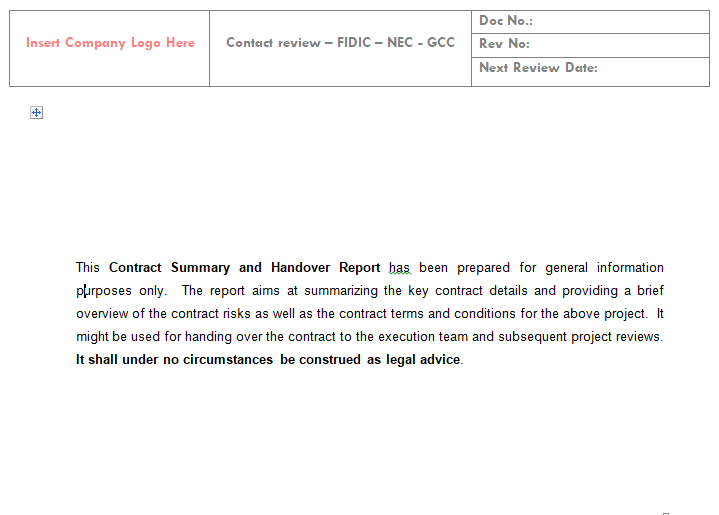 The report aims at summarizing the key contract details and providing a brief overview of the contract risks as well as the contract terms and conditions for the above project. It might be used for handing over the contract to the execution team and subsequent project reviews