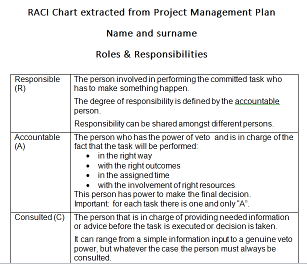 The RACI chart for a typical project is were the Project Manager has flexibility to adapt this based on project organization defined for the project as part of Project Management Plan.